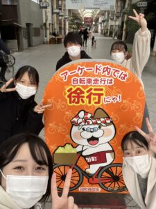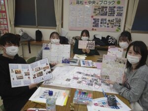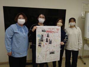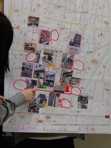 午後はまち歩きSDHという企画で、地図を片手にグループで高齢者や車いすの方が危険だと感じたところを写真に撮ってもらい、研修室に帰ってから拡大した地図に写真を貼っていきました。